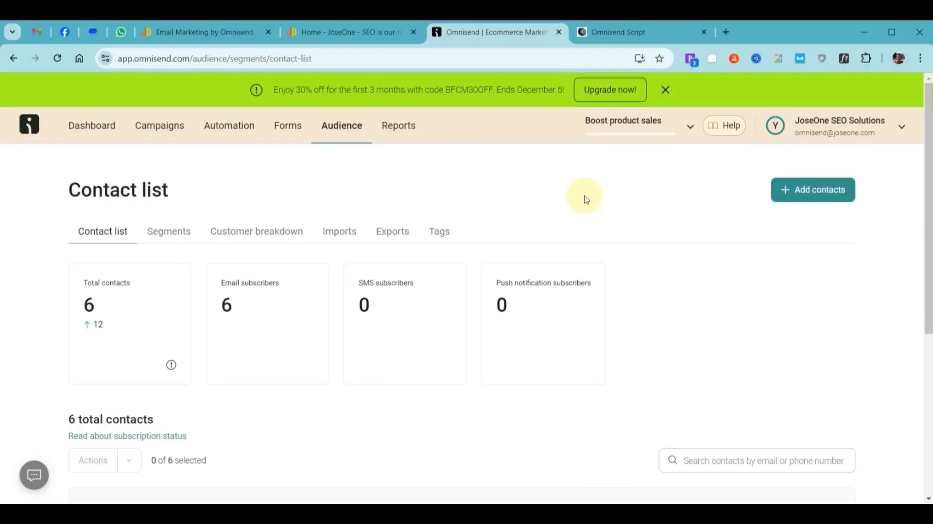 Ας προχωρήσουμε στη δημιουργία μιας email campaign. Θα δημιουργήσουμε ένα email και θα το στείλουμε στη λίστα των συνδρομητών μας. Αυτή τη στιγμή έχουμε έξι επαφές, όλες είναι συνδρομητές, και θέλουμε να στείλουμε μια email campaign σε αυτούς. Το πρώτο πράγμα που πρέπει να κάνουμε είναι να δημιουργήσουμε το email.