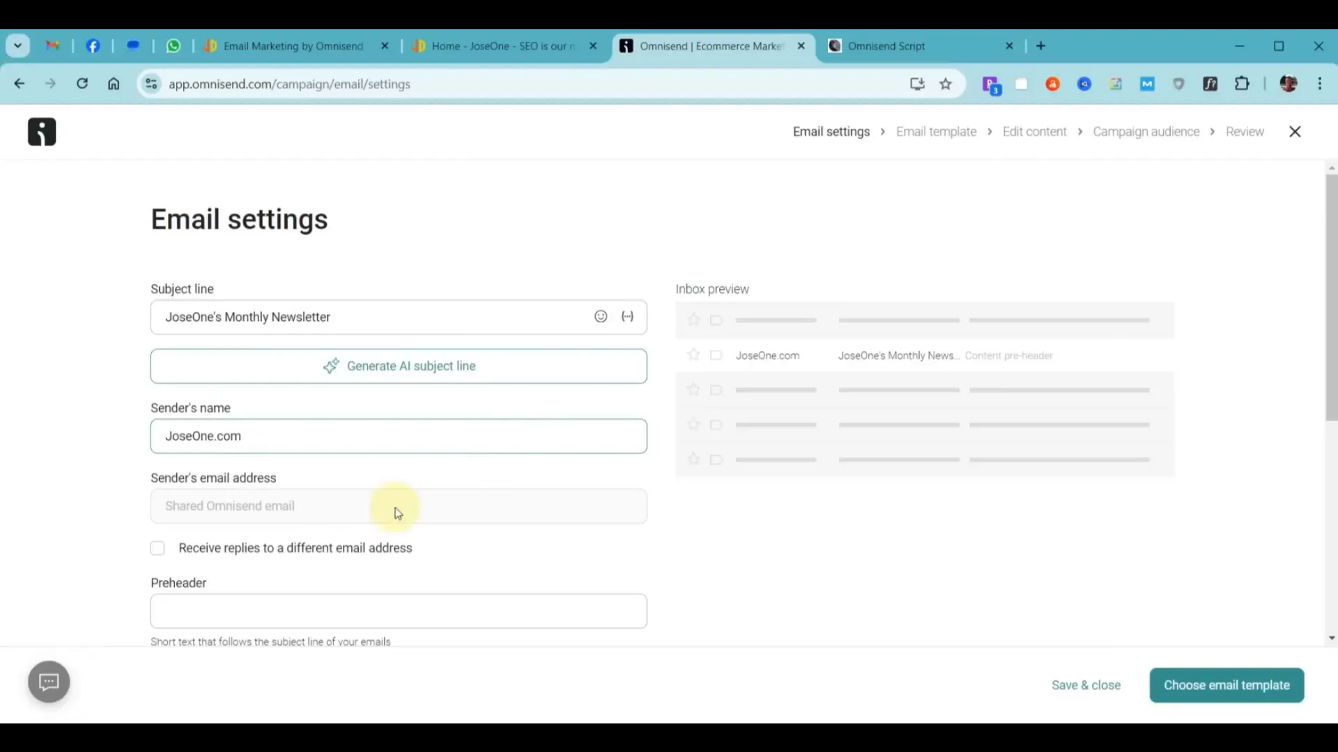 Θα κάνουμε κλικ στην επιλογή «Campaigns» και θα επιλέξουμε το κουμπί «Create Campaign». Στο πεδίο του θέματος, θα βάλουμε «Jose 1’s monthly email newsletter». Για το όνομα του αποστολέα, θα βάλουμε «Jose 1.com», και για τη διεύθυνση email του αποστολέα, θα χρησιμοποιήσουμε την προεπιλεγμένη. Αν θέλουμε να λάβουμε απαντήσεις σε διαφορετική διεύθυνση, μπορούμε να προσθέσουμε μια νέα διεύθυνση email και να τη διαχειριστούμε.